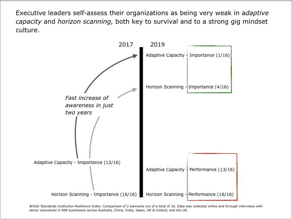 Comparing the results of their 2017 report with that of 2019 shows a dramatic and critical shift in perceptions, both in importance and performance. The perceived importance of these two interdependent capabilities jumped dramatically between 2017 and 2019 from bottom to the top of the list! However, when asked about their performance, most managers felt they were not good at horizon scanning nor at being able to adapt. Simply said, companies have realized how important it is to be adaptive and that horizon scanning is highly important. They recognize their weakness in both.
